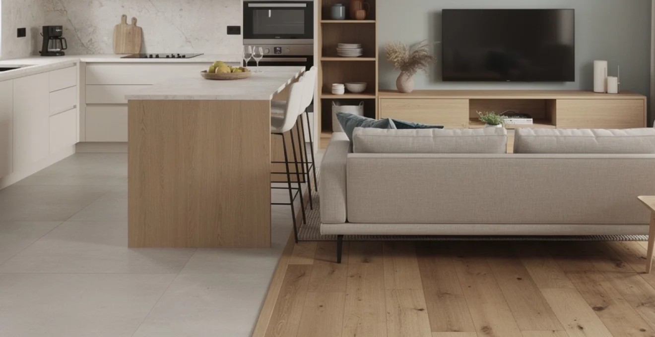 Si vous préférez un revêtement carrelé pour la zone culinaire (pour des raisons d’entretien), l’astuce consiste à choisir un carrelage grand format imitation pierre ou béton dans des tonalités proches du chêne. La jonction entre les deux sols se travaille comme un trait graphique : transition droite nette, découpe en chevron ou insertion de quelques carreaux de ciment au milieu du parquet. Dans tous les cas, le but est d’obtenir un mix sol harmonieux plutôt qu’une rupture brutale.